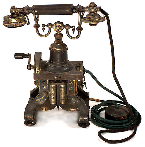 'This is an Ericsson 'skeletal'; the ram's horns or metal bars that form the legs are in actual fact the magnets that when the the handle is turned in the generator body creates ac voltage to signal the manual operator or in a point to point service the other phone at the other end. There should be on the deck which is made of ebonite a serial number by which I can accurately date the phone, 1892 is the common year by which these certain types of phones were manufactured from, they were made from memory up until the late 1910's early 20's. It is basically an early magneto telephone desk set. I have more info at Hawthorn in early Ericsson catalogue detail if you wish this.