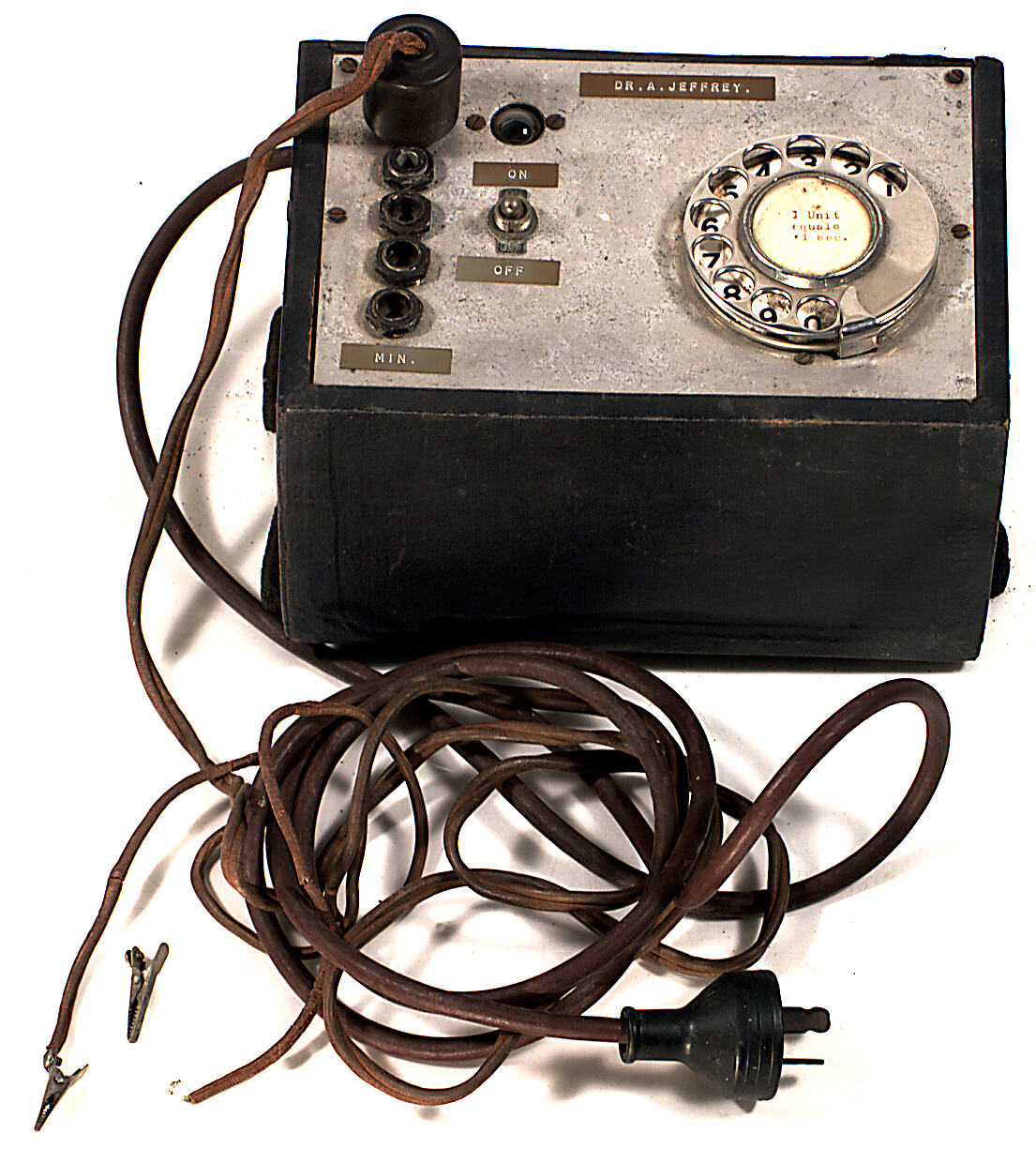 An electro-convulsive therapy machine circa 1940 used by Dr. A.Jeffrey in a mental health hospital in Victoria, Australia. In 1949, Dr Jeffrey was practising at Aradale, Ararat. He had moved to Armadale by 1951. See relevant issues of the Register of Medical Practitioners. ECT was used in the treatment of patients in mental health hospitals.