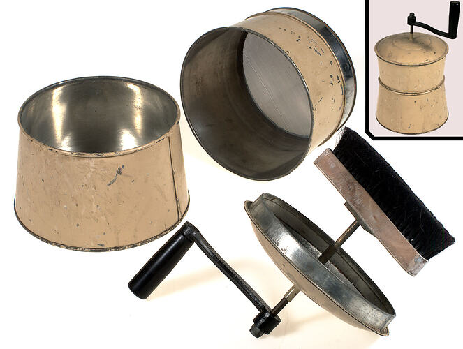 Drug sieve has a round wide tin base with a detachable smaller round tin with a sieve base which fits into the base. Has a lift-off lid with a metal rod through the centre, with a brush attached. On the top of the lid is a handle which rotates the brush on the sieve.