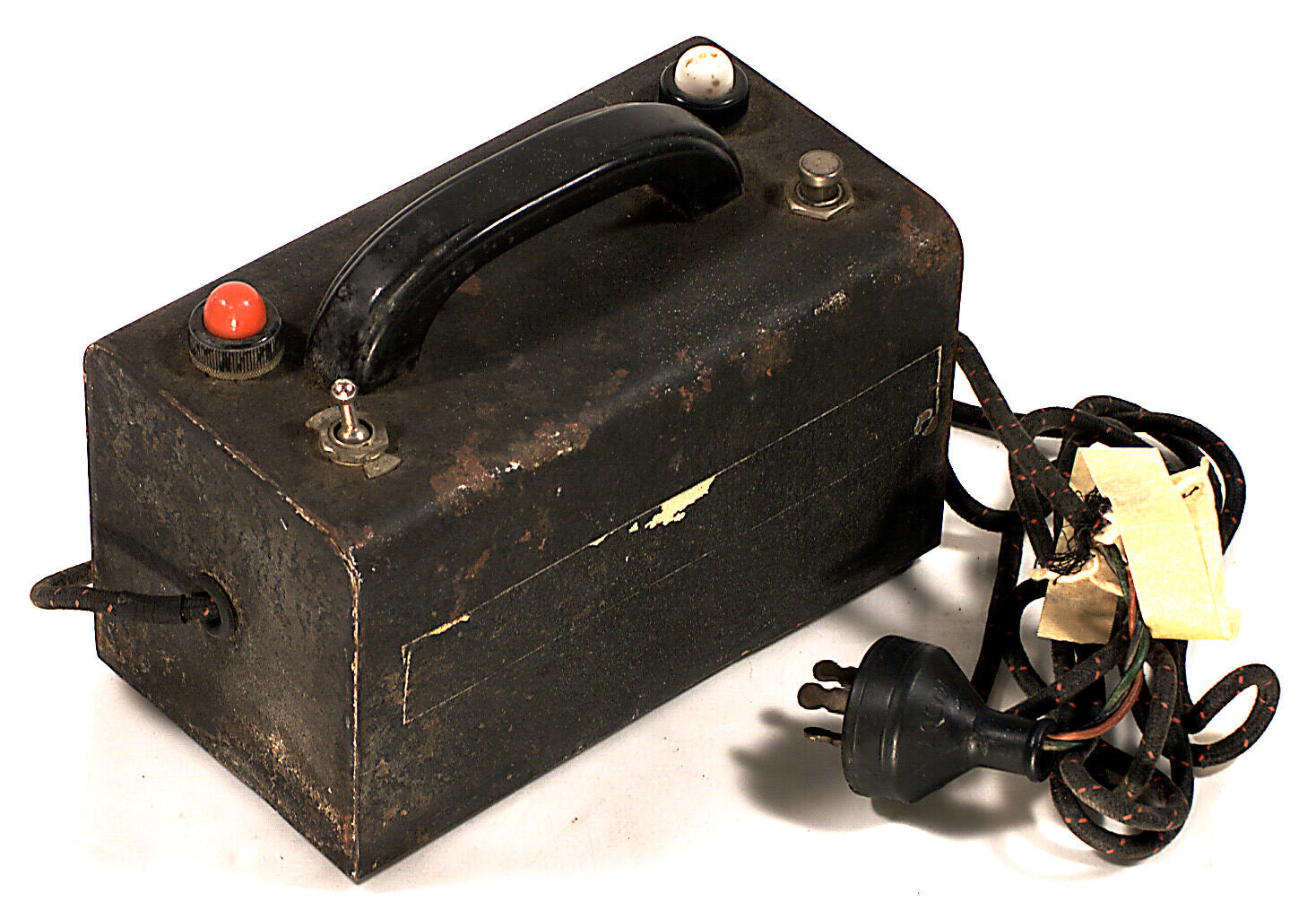 Electro-convulsive apparatus is an oblong box with a plastic handle in the centre on top. Two light bulbs each side and a main power switch with a metal push-button. Has electrical cord and power point. Part missing.