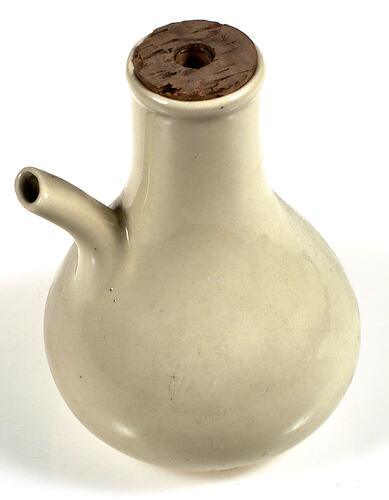 White china feeding cup, 19cm high. It is shaped like a vase with a round base and body. It narrows up to a straight neck with a 5cm opening for a cork. In the centre of the cork is a glass tube, flattened at the lower end. A slightly curved and flattened short drinking spout emerges from the side of vessel halfway up where the cup begins to narrow into neck.
