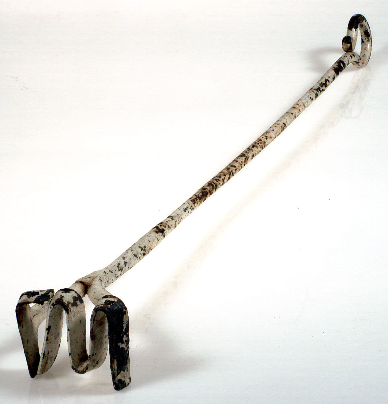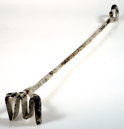Long iron rod which branches at one end to support the brand "LW". The other end is bent to form a loop handle. The branding iron has been painted white.