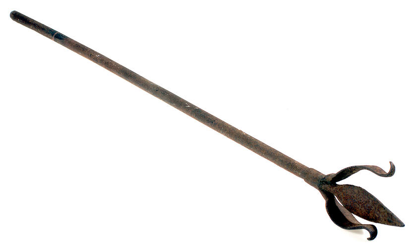 Rod of iron topped with a decorative spike shaped like a spearhead with a curved, leaf-shaped piece either side.