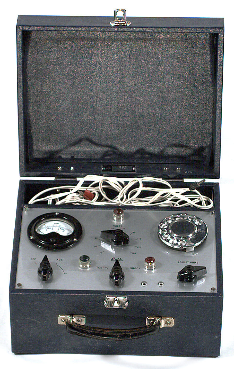 Electroconvulsive therapy machine in blue plastic case with leather handle. Brand name 'Both'. Panel of machine includes a scale for measuring ohms and volts; a knob for administering volts from 70 to 160; two red lights; a tele- phone dial numbered 1-0; a green light; a knob to be turned from 'Test' to 'Shock'; and a knob labelled 'Adjust Ohms'. A white electric flex cord for conveying current is also included.