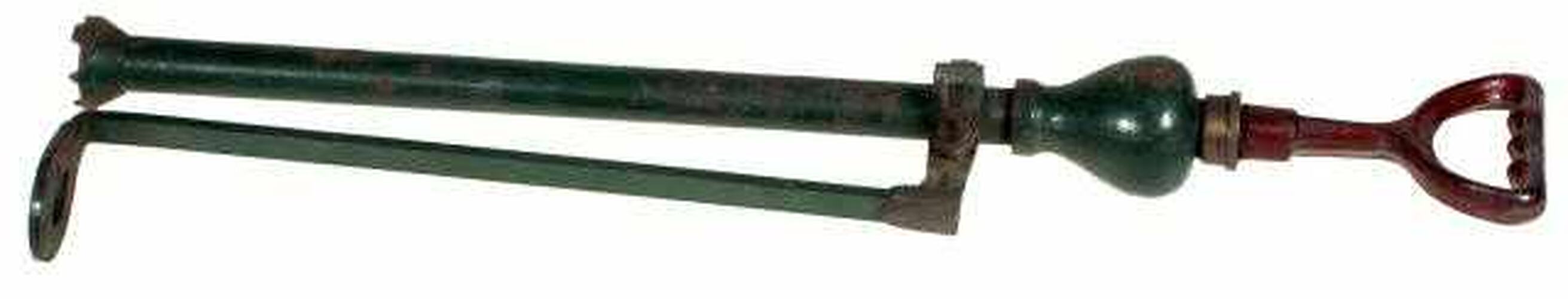 According to Mr Arthur Atkins these stirrup pumps were bought and kept in case of emergency during World War II as a precaution against fires caused by incendiary bombs. Simpson's had an air raid shelter. A shield used by the Air Raid Patrol Warden was also found. Bottom of pump was placed in a bucket of water, secured by foot and hand pumped.