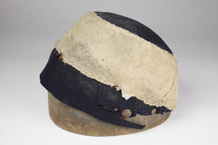 Wooden hat block with navy felt hat shape with band of cream webbing attached to the block with two tacks at base of shape on left hand side. There is another tack on the right hand side 1 cm from the base of the block. The block base has a central 3cm square hole, 5cm deep. There are four round holes drilled into the base: east and west side are 2.5cm in diameter, 4.5cm deep; and north and south are 0.7cm in diameter.