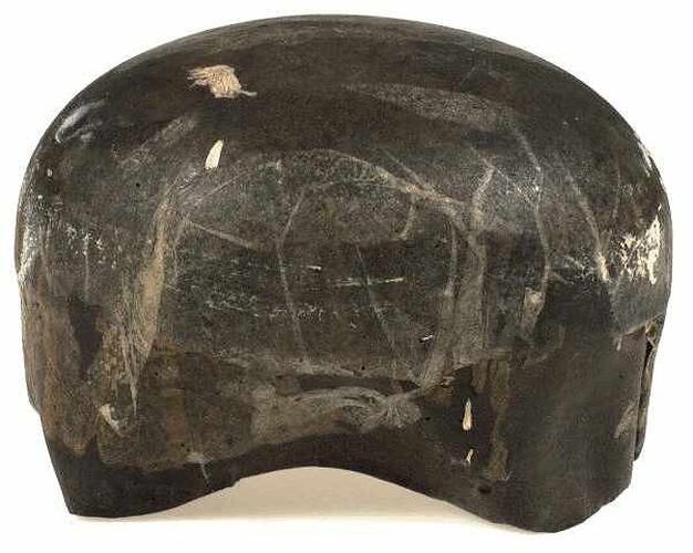 Wooden hat block with remnant fabric.