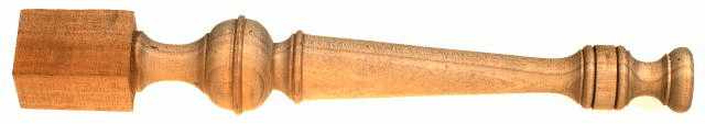 Turned furniture leg which has been fashioned from a single piece of unvarnished wood.
