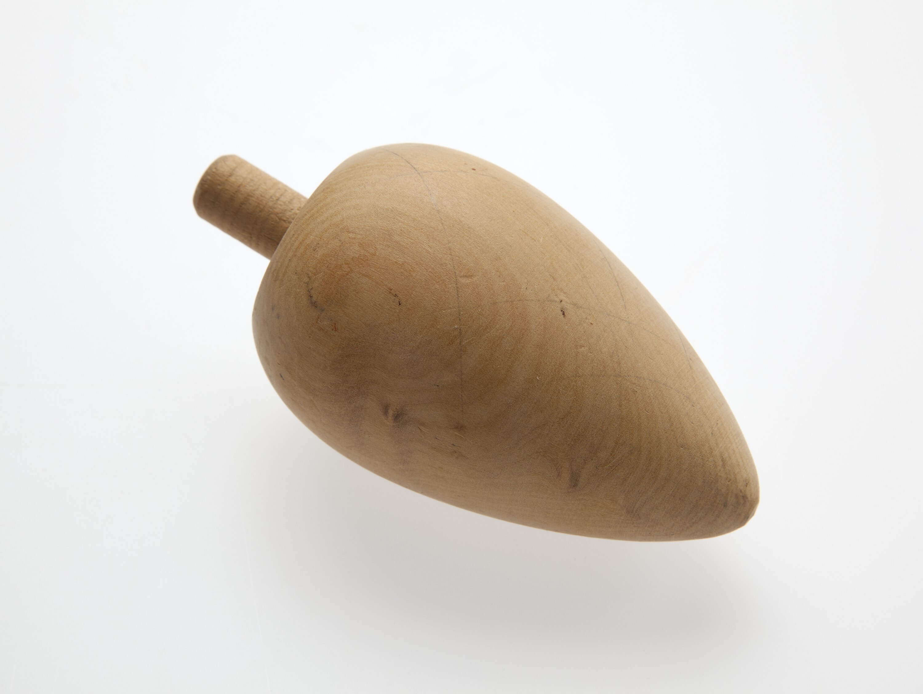 This piece appears to screw or be inserted into another. It is avocado-shaped (but with one end more pointed). At the base there is a cylindrical projection for insertion into another piece. Found in Area A of workshop.