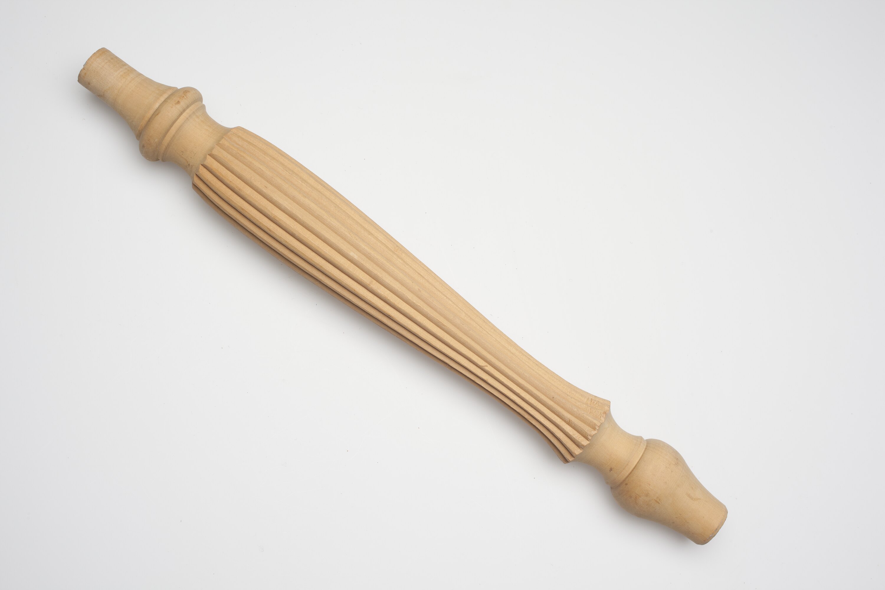 Elaborately turned piece. The ends are tapered, then flare, then taper. The middle section consists of vertical grooves. Found in Area A of workshop.