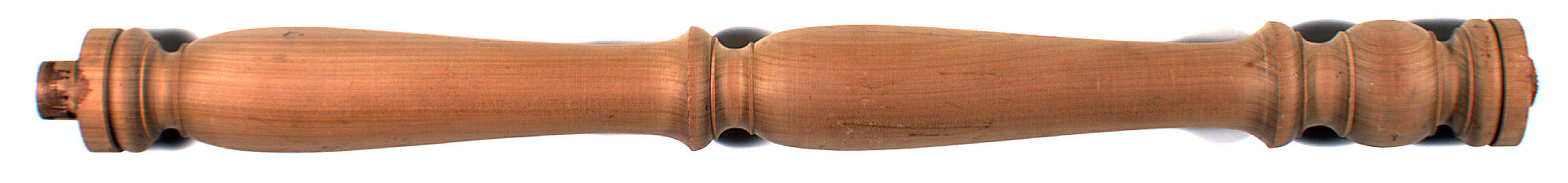 Long furniture leg made of pale gold-coloured wood. Base section of leg has two wide grooves separating three circular raised segments; body is smooth and rounded with a central groove; upper section has one groove with two disc-shaped forms above this; bottom end is flat; top end is flat with a short raised cylin- drical segment projecting from the centre. Found in Area A of workshop.
