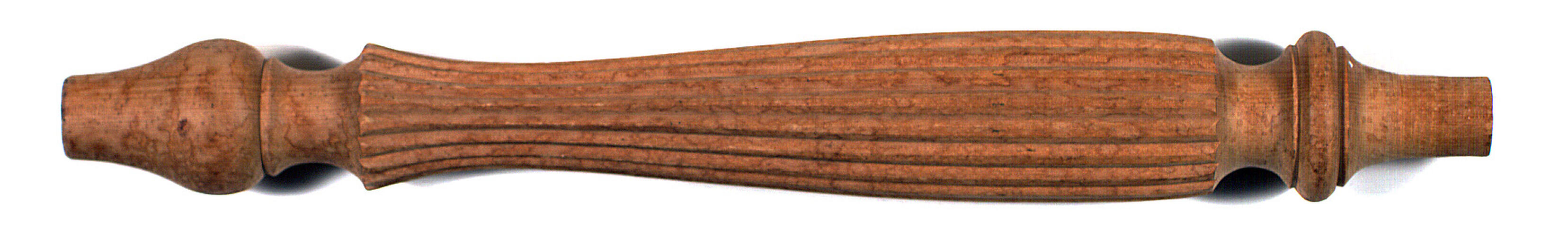 Elaborately turned piece. The ends are tapered, then flare, then taper. The middle section consists of vertical grooves. Found in Area A of workshop.