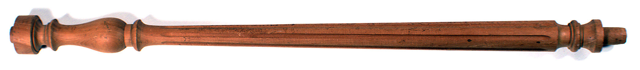 Long, slender furniture leg with tapering fluted body and elaborately turned, rounded ends. Short, cylindrical sements project from centre of both ends. Leg is made of gold-coloured wood. Found in Area B2 of workshop.