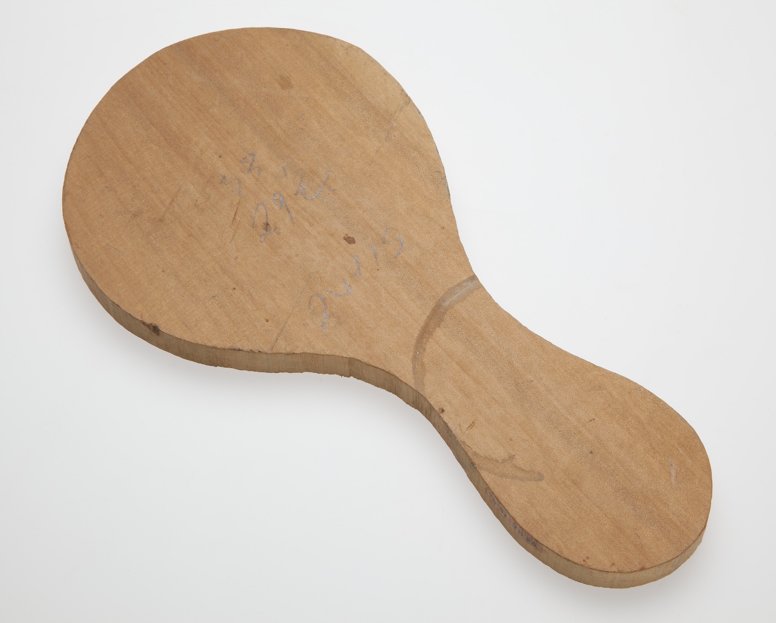 Mirror base made of pale gold-coloured wood and shaped like an elongated pear. Both faces of mirror base are flat. Found in Area A of workshop.