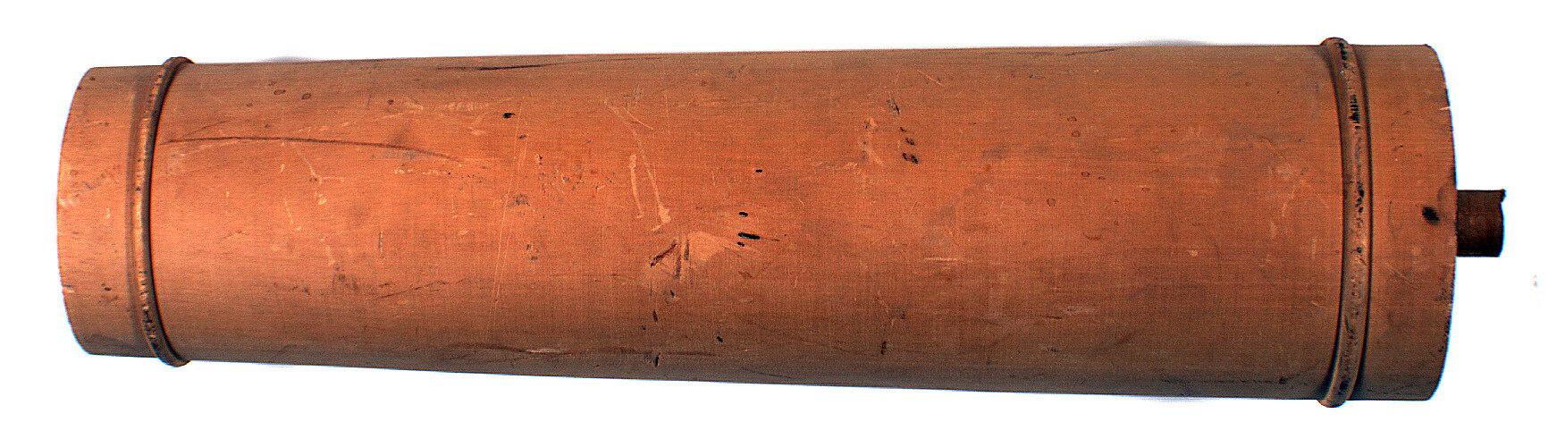 Large, plain, cylindrical object made from light gold-coloured wood. Object tapers slightly toward one of the two flat ends and has one thin raised rim situated near each end. Short cylindrical segments project from the centre of each end. Object is comprised of three segments of wood, glued together along their vertical axis.