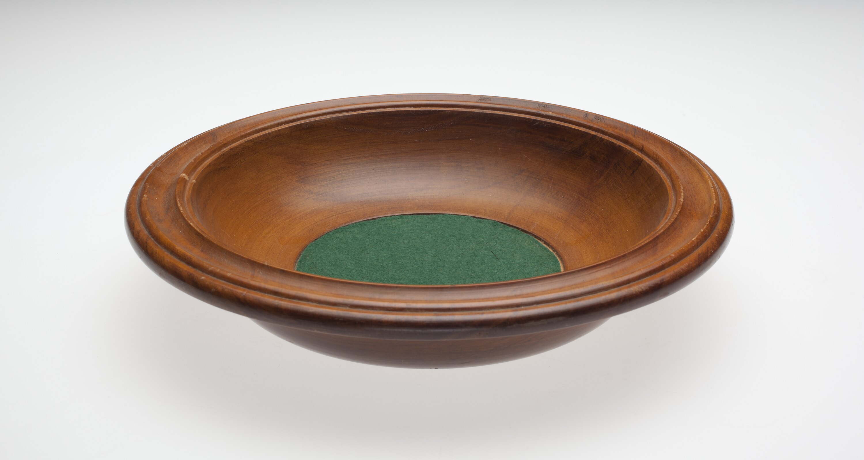 Collection plate made from varnished, golden brown-coloured wood with a pro- nounced, swirly, dark brown grain. Plate is bowl-shaped with a flared rim which is elaborately grooved on the exposed side of the plate. Two circular pieces of felt are affixed on shallow circular depressions in the centre of the base and underside of the plate. Found in Area A of the workshop.