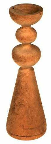 Ornament made from light gold-coloured wood. Lower section of the body is cone- shaped whilst the upper section has two rounded forms and a shallow cup shape separated by three deep, narrow grooves. The item is made from two symmetrical halves joined along the central vertical axis of the body. Found in Area A in workshop.