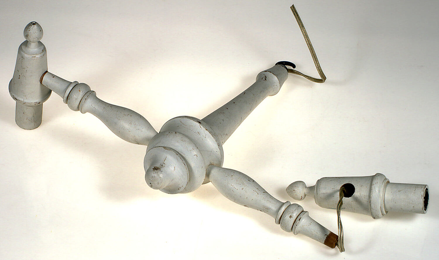 Light fitting made from pale gold-coloured wood painted white. Found in Area A of the workshop.