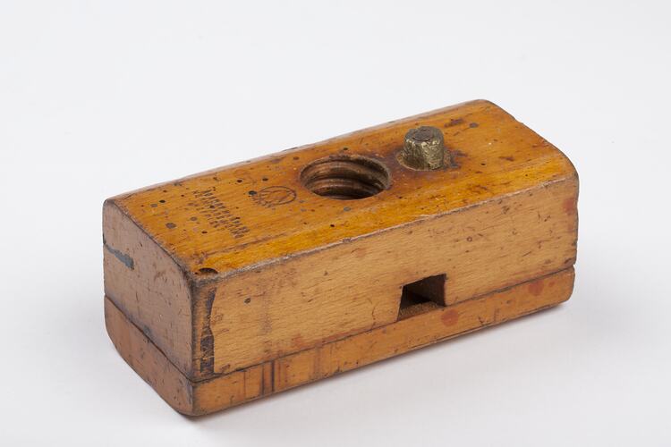 Rectangular block of two pieces of wood, one screwed on top. There is a hole through the block from top to bottom. Within this hole is a blade - a cutter held in place between the two pieces screwed together. The inside wall of the hole has a spiral shape cut into it. There is a turn screw at the bottom. Found in Area E3 of workshop.