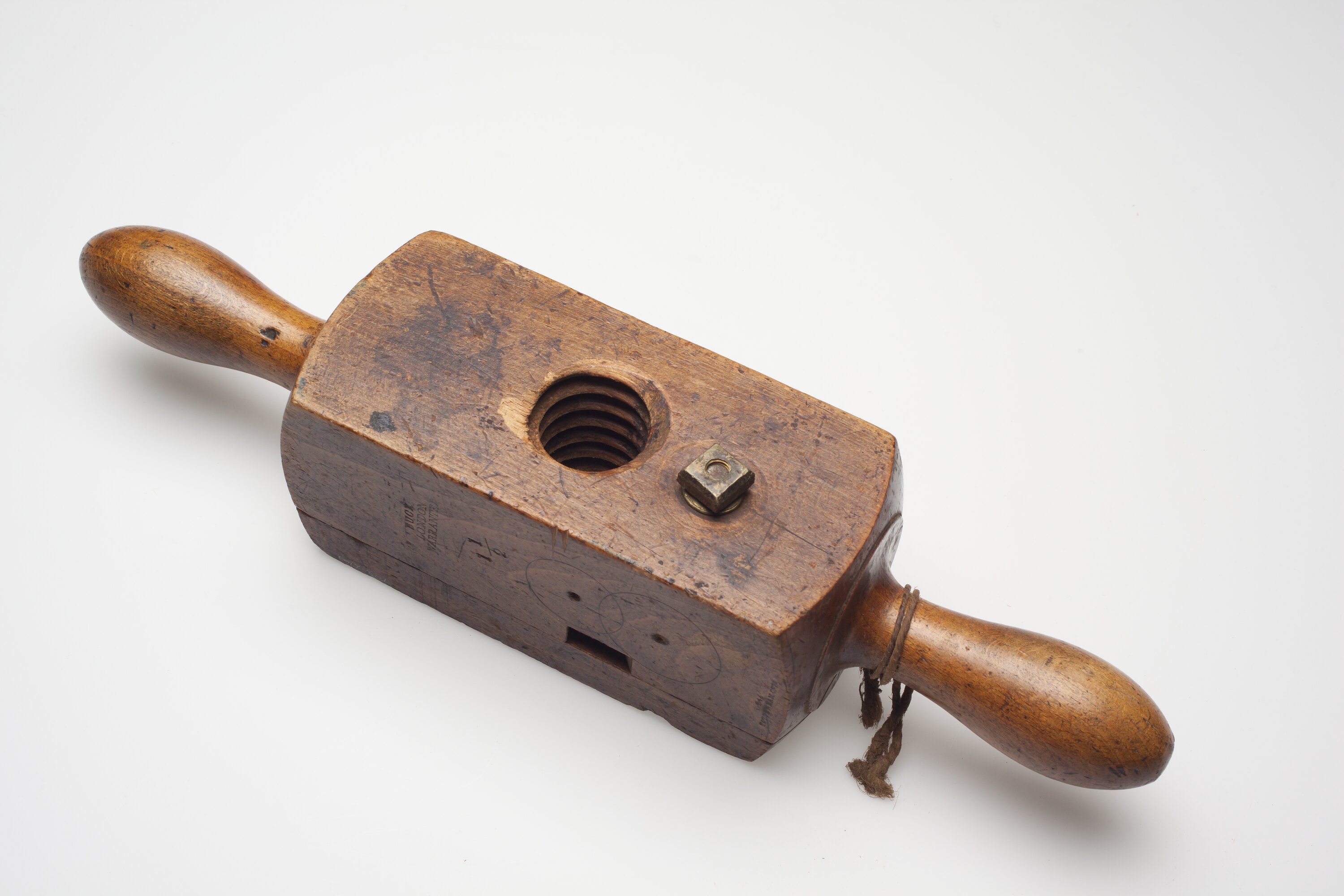 Screw box for cutting wooden threads. Made by G. Buck, London, circa 1900-1940.