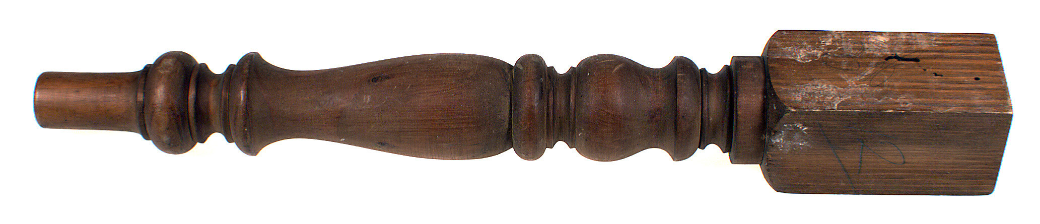 Furniture leg with rectangular base and elaborately turned, rounded body which tapers to a point at the top. The leg is made from chestnut-coloured wood. Found in Area B2 of workshop.