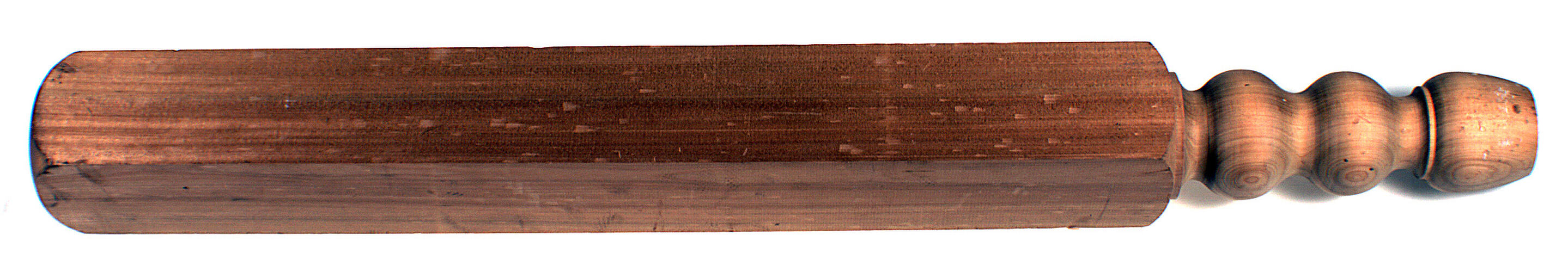 Furniture leg made from pale coffee- and cream-coloured wood with a pronounced wood grain. The bottom section of the leg is composed of three bulbous forms separated by wide grooves. The upper section is rectang- ular. Both ends are flat and the top end has a cylindrical channel extending 4.9cm. into the body. Found in Area B2 of workshop.