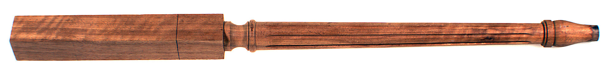 Long, elaborately turned piece with square base from which follow some turned curves. The main section consists of vertical grooves, topped by more curves. The top tapers slightly. 23.8cm. up from the base is a pencil line that is drawn on all four panels of the base. Found in Area A of workshop.