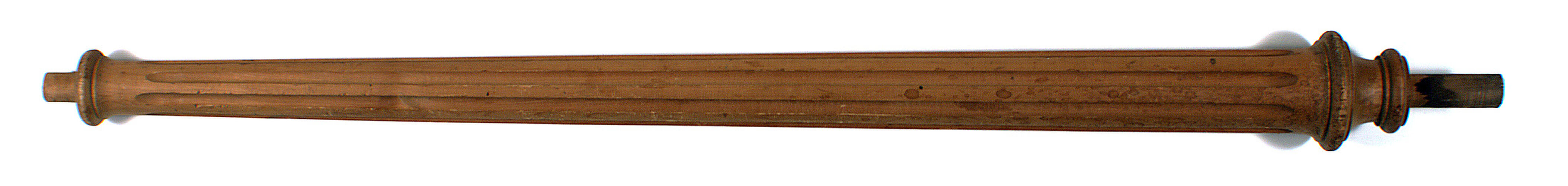 Furniture leg made from rich, gold-coloured wood. Body is cylindrical and fluted and tapers towards one end. Tapered end of the body flares out and becomes a flat, circular end with a short, cylindrical section projecting from its centre. The other end of the body flares out and becomes a wide concave groove with a raised disc-shaped end. A long cylindrical section projects from the centre of the flat surface of this end. Found in Area A in workshop.