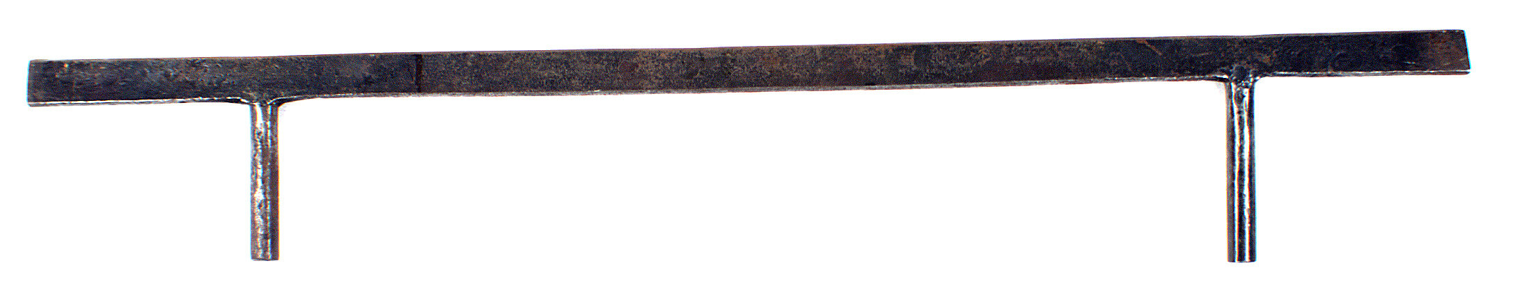 Long, thin, rectangular metal length curving to edge at top and with round, solid metal pole welded on slight angle at bottom towards each end. Found in Area B2 in workshop, resting near lathe.