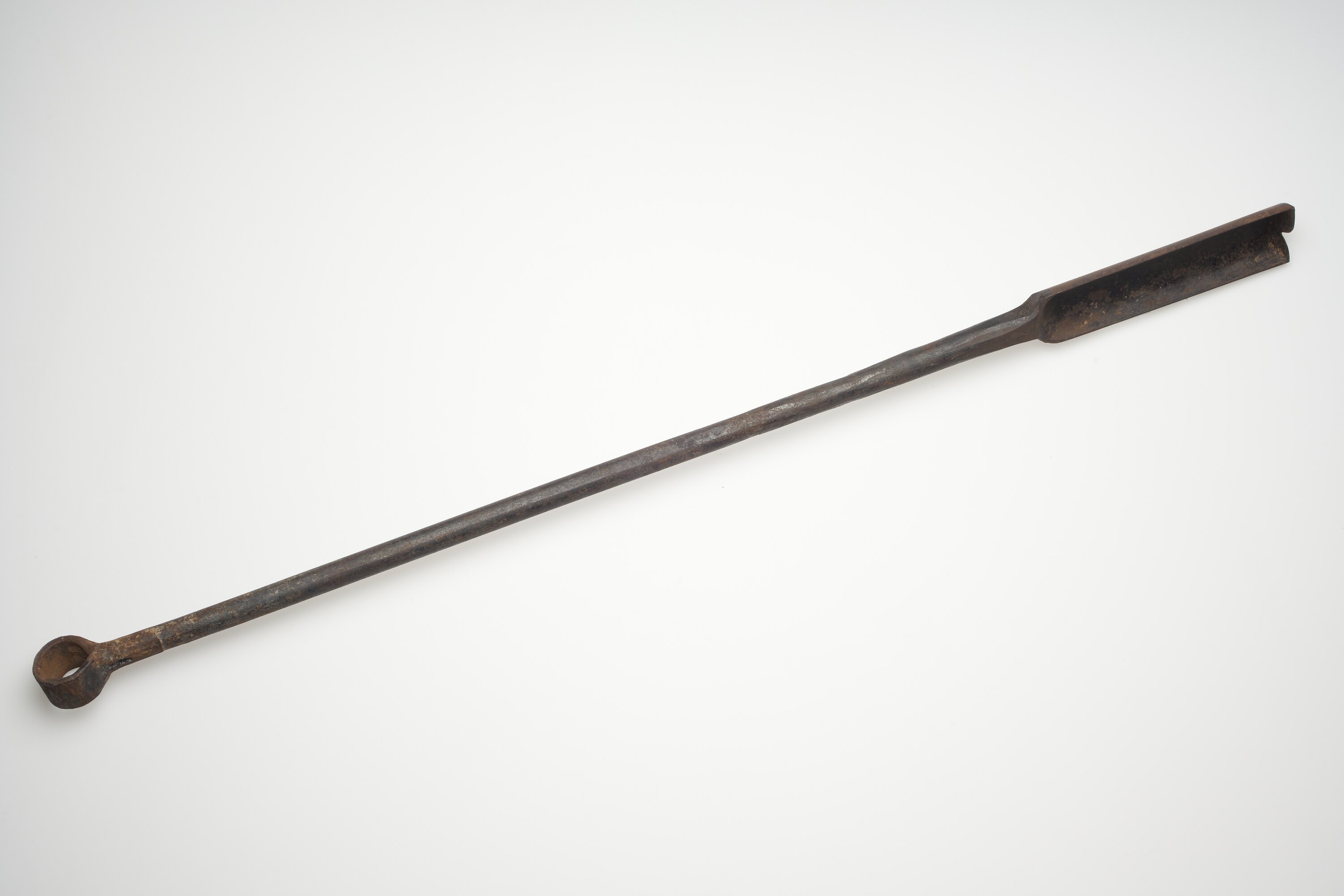 Blackened steel borer, the base of which forms a sharpened semi-circular gouge for boring holes in furniture legs. The tool can be used manually or fitted to a lathe and operated by machine. At the shank end of the tool is a cylinder through which a handle can be fitted.