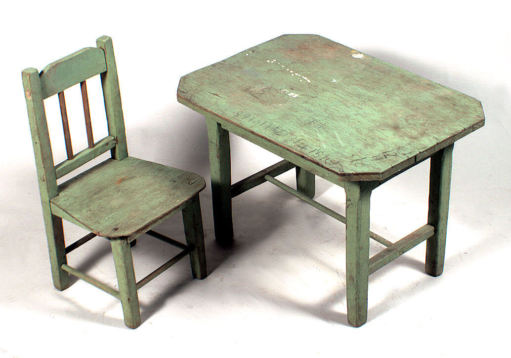 Small wooden table and chair, painted green. Chair has straight back with two vertical dowels. Table rectangular, with cut-off corners. Paint worn off both pieces.