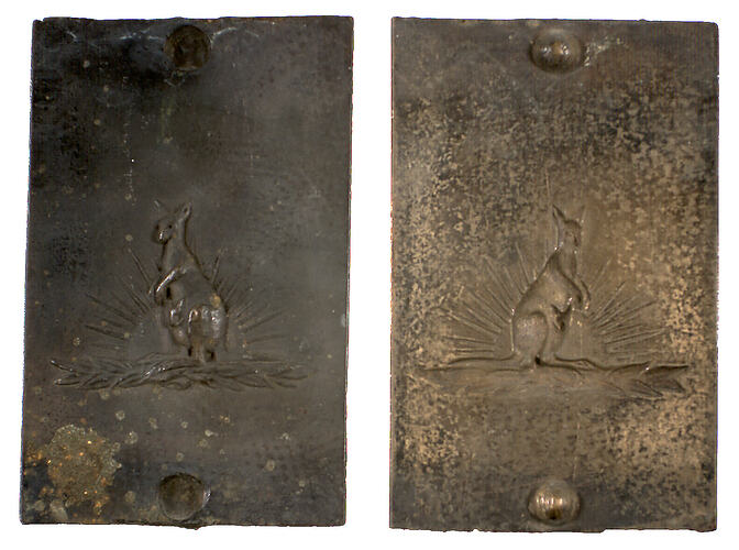 Brass mould of upright kangaroo with rising sun behind and leaves at feet. Used to press (imprint) shape into leather goods at Simpson's Gloves Pty Ltd, Richmond.
