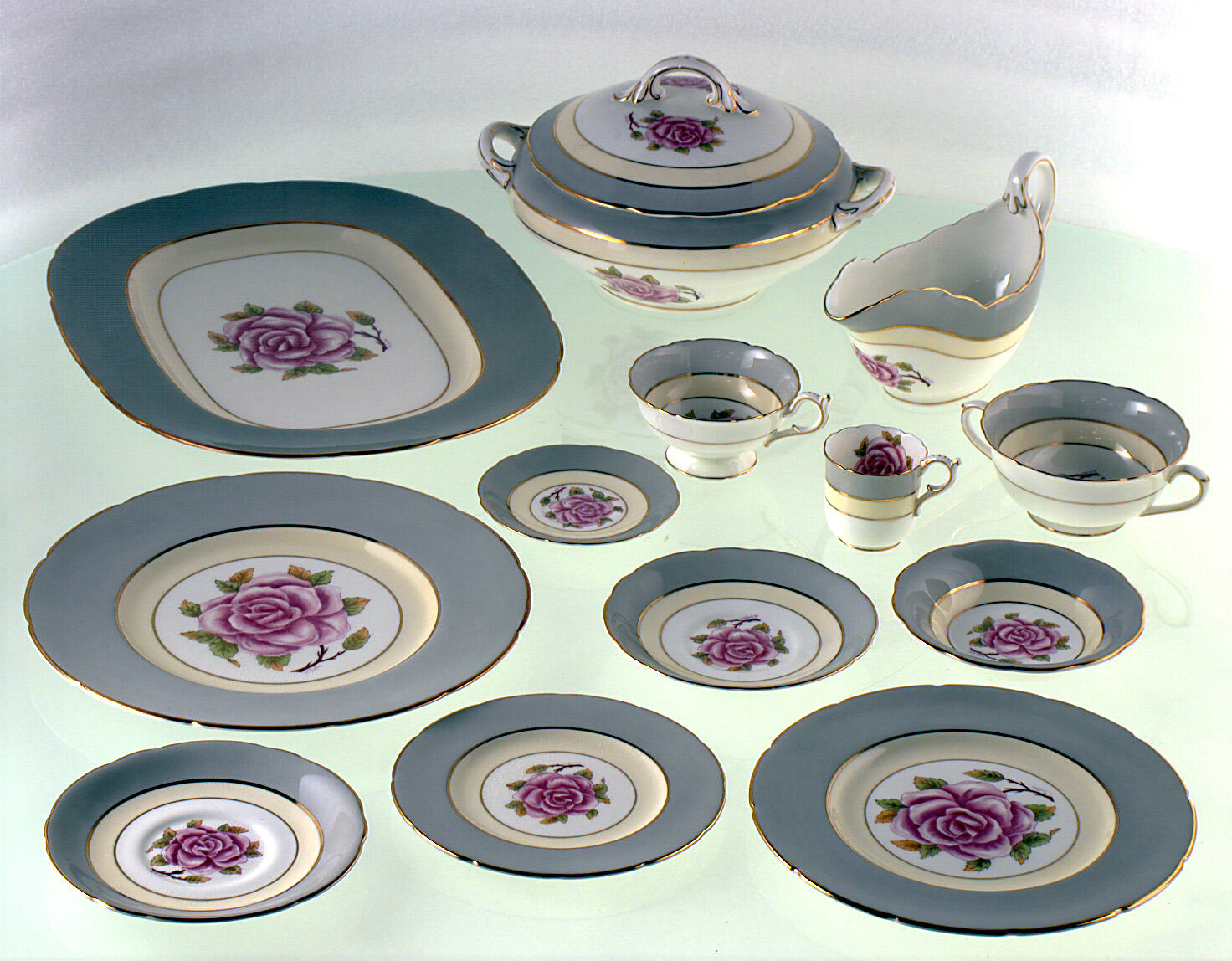 Coalport 'Romance' (Grey Rim) pattern dinner set made in the 1920s. It was used by Her Majesty Queen Elizabeth II and HRH The Duke of Edinburgh during their stay at O'Shannassy Quarters (Lodge/Chalet/Weir Quarters) in Warburton from 6 to 8 March 1954, during their Australian tour.