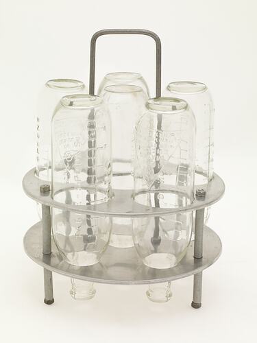 Circular metal rack with six babies' bottles used about 1929. Each bottle marked for 8 ounces or 16 tablespoons.