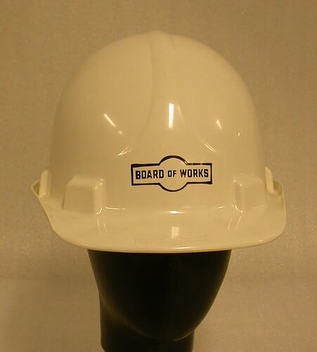 White, hard plastic helmet shaped in one piece with front brim. Labelled 'Board of Works'. Made by North.
