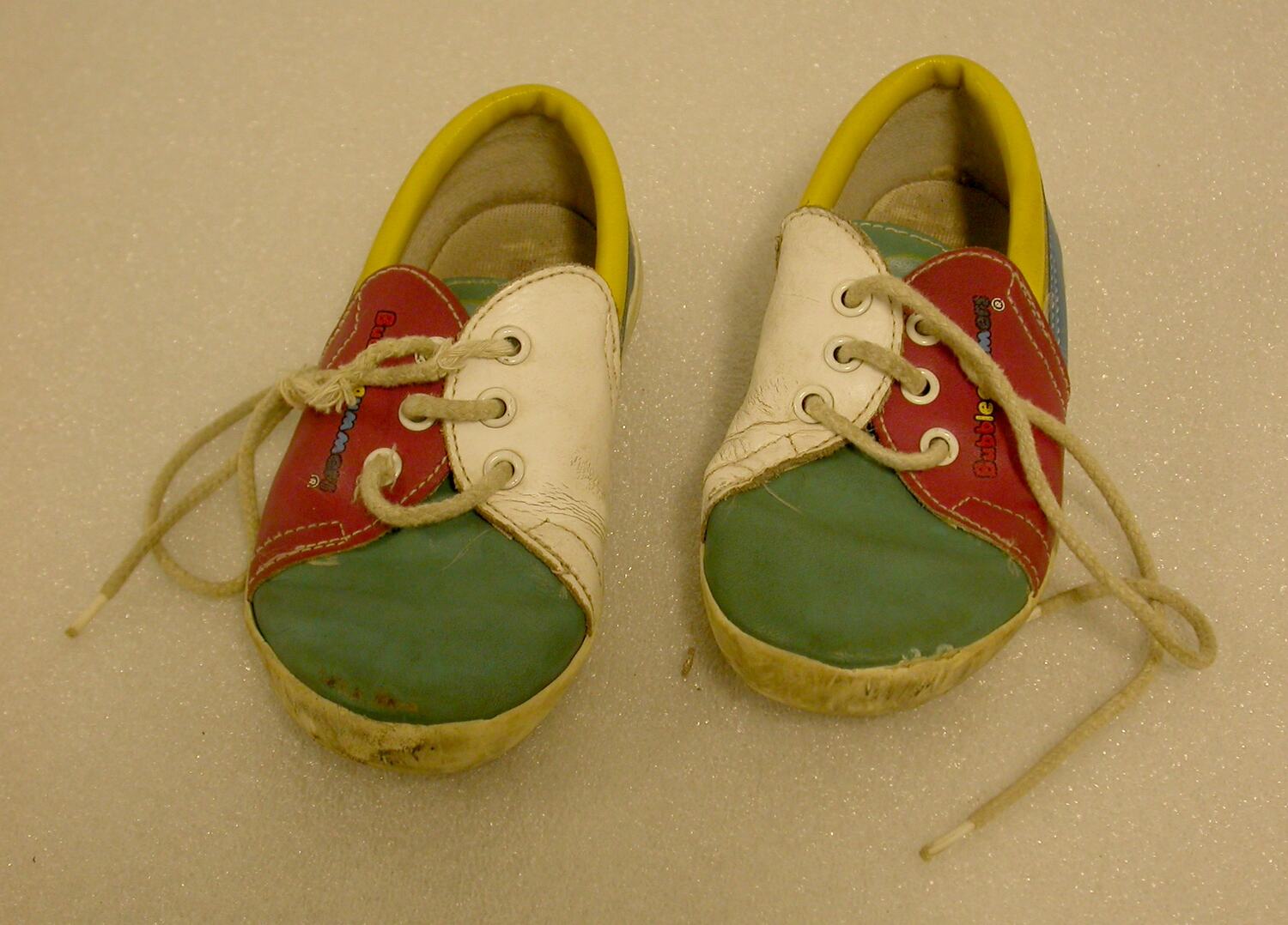 Child's leather sand shoes with uppers made of different coloured patches: blue, yellow, pink, turquoise and white. White cotton laces are threaded through three pairs of eyelet holes. White stitching throughout. White synthetic soles and innersoles.