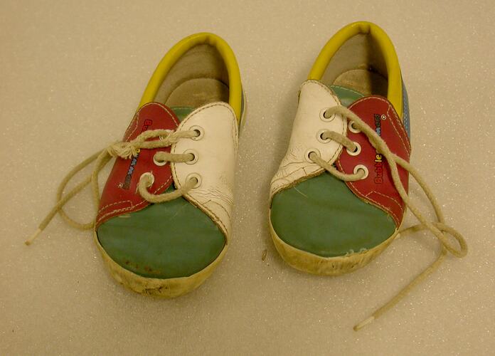 Child's leather sand shoes, in green, white, red and yellow. Made by Bata, Australia, probably in the late 1980s. Worn by Alice McCabe, daughter of the donor, Honor Godfrey, when the family lived in Highett Street, Richmond, Melbourne.
