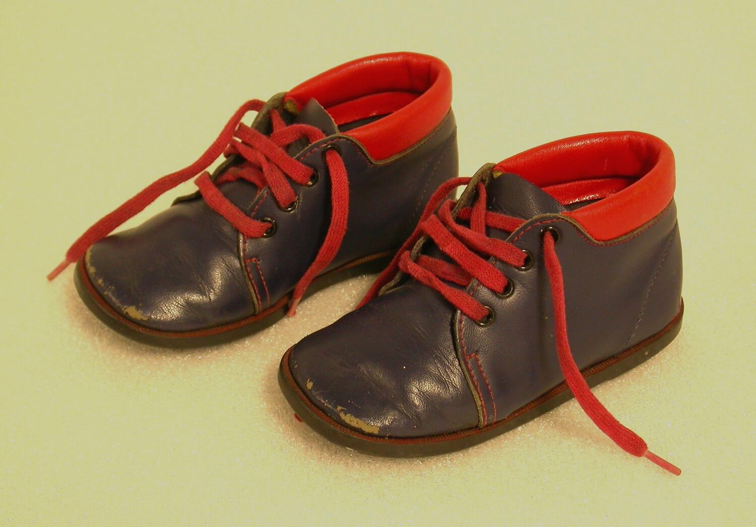 Blue leather dress ankle boots with red nylon trim, made by Jiffies. They were worn by Thomas McCabe, son of the donor, Honor Godfrey, when the family lived in Highett Street, Richmond, Melbourne. Thomas was born in 1987. The donor decided to collect all of her daughter Alice's shoes over a period of several years. A few pairs of Thomas's shoes were donated to the Museum as part of this collection.