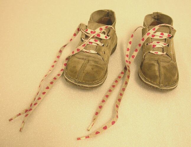 Worn by Alice McCabe, daughter of the donor, Honor Godfrey, when the family lived in Highett Street, Richmond, Melbourne. They were useful for teaching Alice to tie her shoelaces. She also had a frame with practice laces on it, given to her mother when she was having Alice.