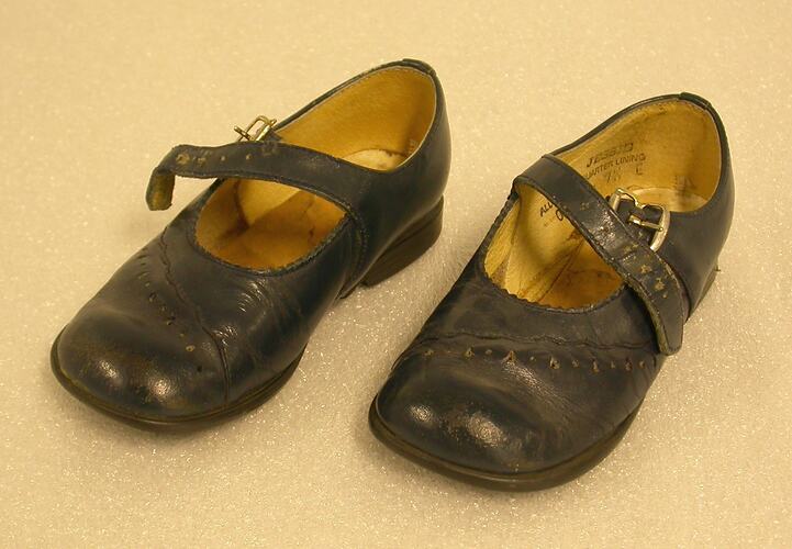 Worn by Alice McCabe, daughter of the donor, Honor Godfrey, when the family lived in Highett Street, Richmond, Melbourne. Alice was born in London in 1984. Most of her shoes were purchased from shop, Betsy Pryam in Burke Road, and were relatively expensive at $50-$60 per pair. The donor was recommended to this supplier by a friend, since she was a stranger to Melbourne and Australia. She was conscious of the shoes being 'Australian' - they were not particularly what she would have chosen had they been living in England. The shoes were chosen both for their convenience and to match the colour of Alice's clothes. The donor decided to collect all of Alice's shoes over a period of several years.