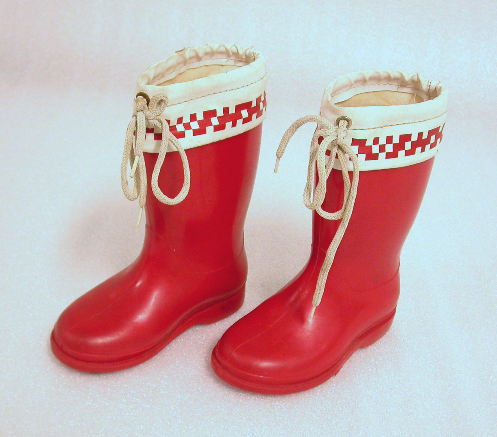 Red plastic boots with red and white patterned vinyl trim around the tops and drawstrings through the gusset at top.