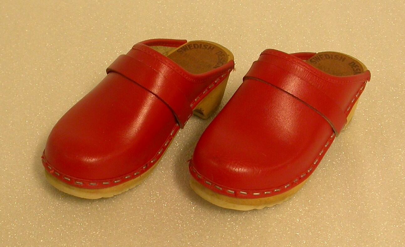 Label, printed: SWEDISH DESIGN/[Illegible]/M...lia/ANATOMIC/ GENUINE/LEATHER. On sole: MADE IN SWEDEN. Stamped into underside of wooden soles: 30.