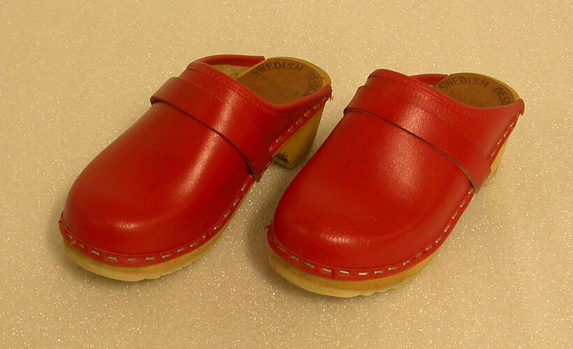 Pair of red child's clogs with leather uppers and wooden soles. Backless, a plain strap reinforces the shoe upper. Upper stapled on to base, sole covered with layer of ridged synthetic polymer where shoe contacts ground. Leather look label glued to inside of shoe at heel.