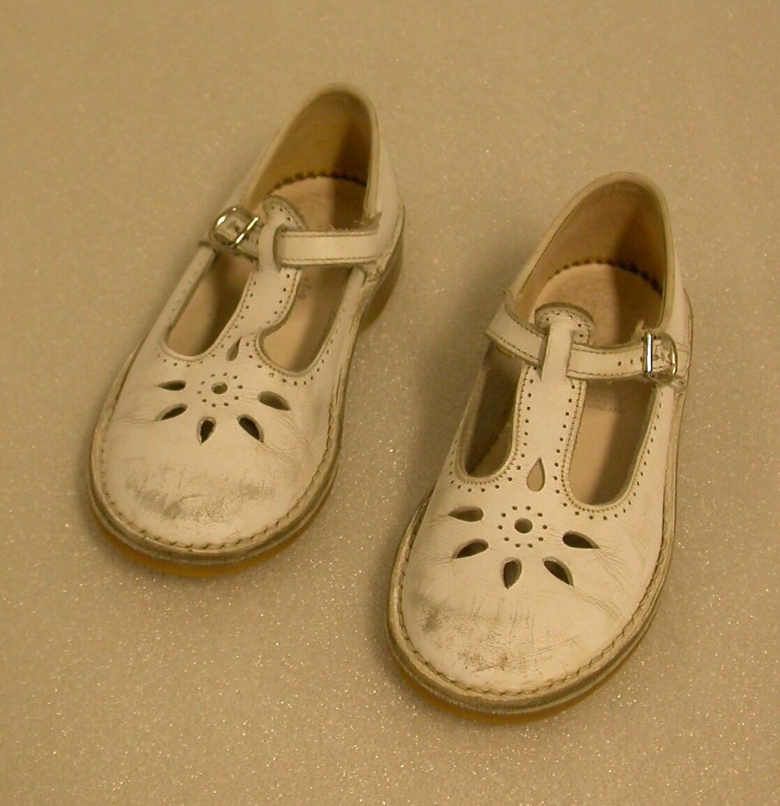 White leather casual shoes with T-bar and buckle, made by Clarks. Worn by Alice McCabe, daughter of the donor, Honor Godfrey, when the family lived in Highett Street, Richmond, Melbourne.