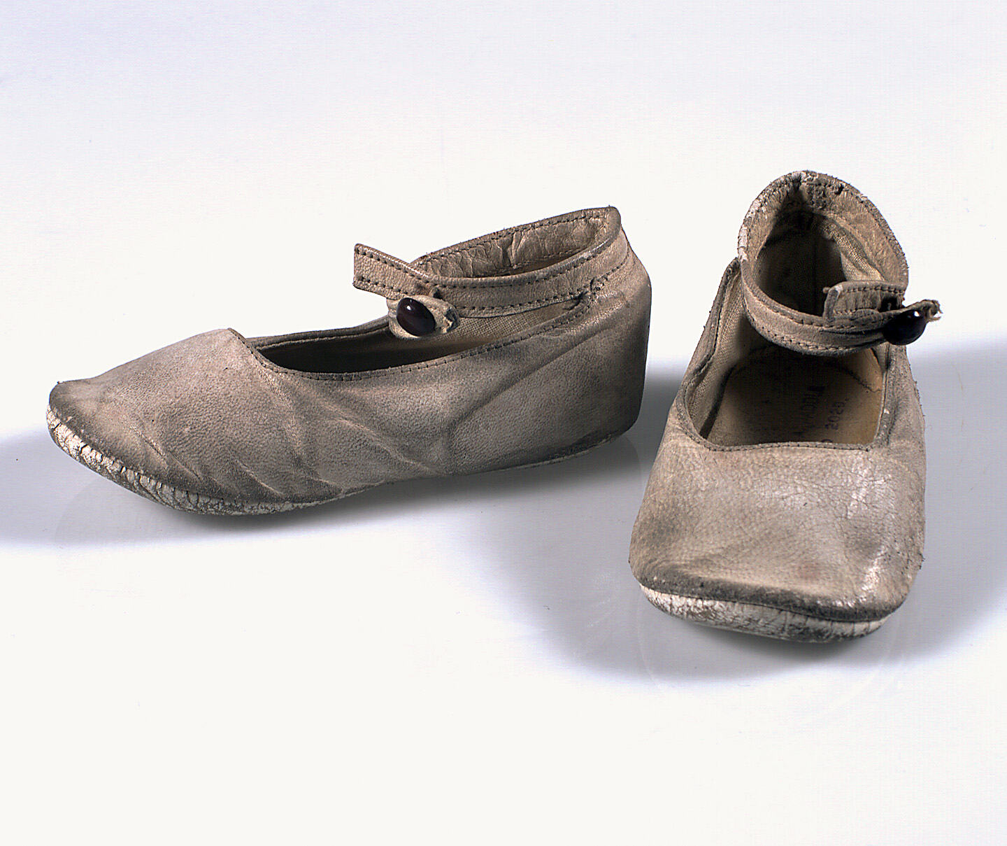 Pair of white leather baby shoes with button-up ankle strap. Leather has been given a satin finish and is lined with white cloth. The shoes have been soled with white leather.