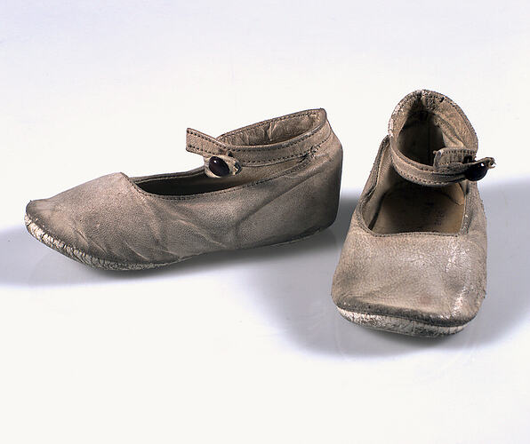 Pair of white leather baby's shoes, used in Albert Park, Melbourne, circa 1909-1911. Acquired in 1990 during the South Melbourne Oral History project. They were worn by the donor at the age of 18 months - 2 years. She kept the shoes as a childhood memento.