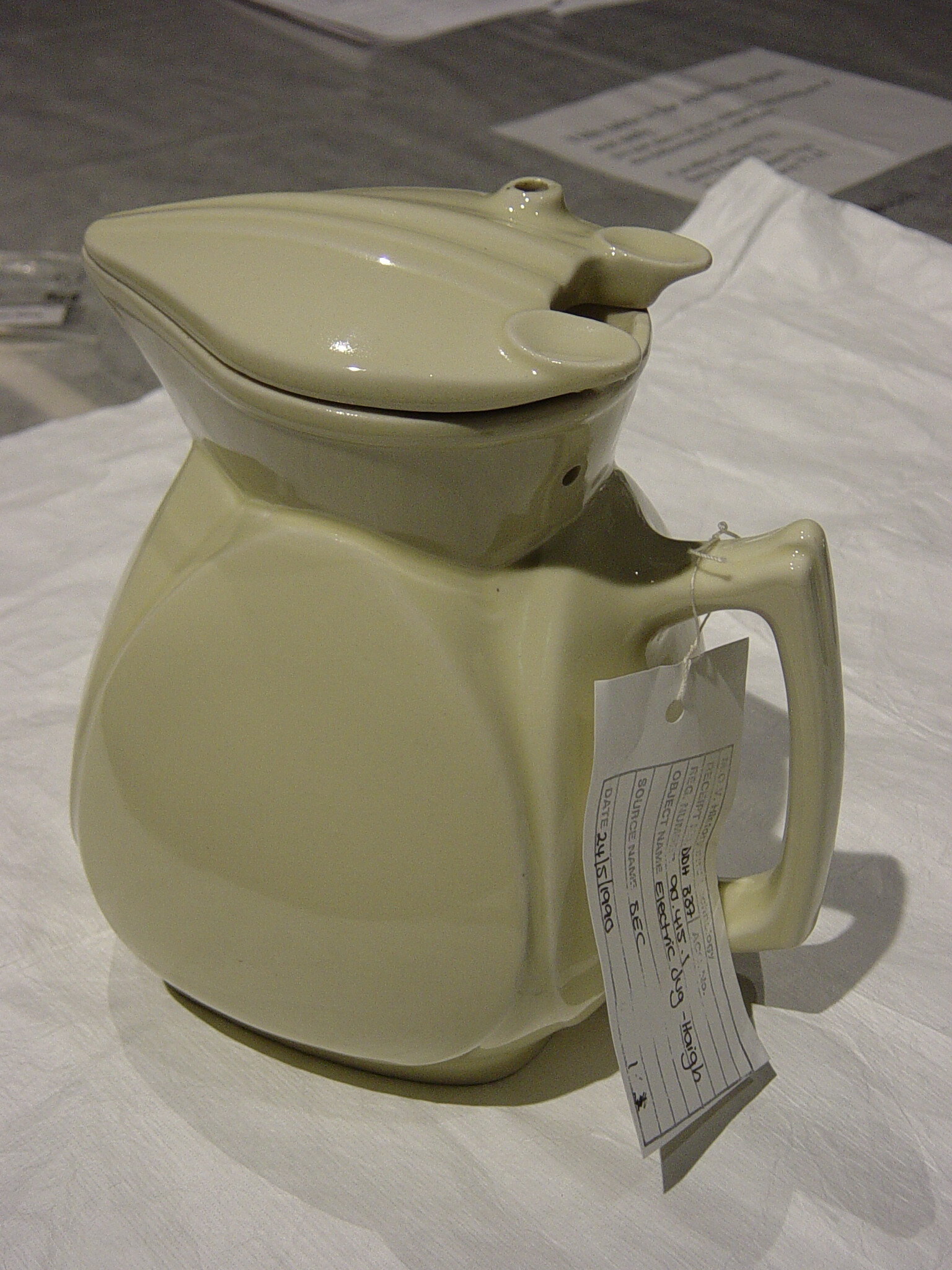1: Pale yellow ceramic electric jug, pear-shaped, with ceramic lid which has thumb-grips and ridges along the centre. The lid is fastened to the jug with one screw and slides across to open the jug. Base of the jug has sticker . 2: Accompanying S.E.C. Approvals Board label has ref.no. AT/GX/01 and manufacturer's name and address.