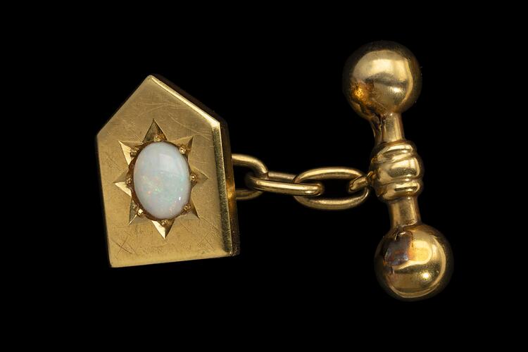 One of a pair of gold and opal shield design cufflinks made by Henry Newman, Melbourne, Victoria, circa 1900.