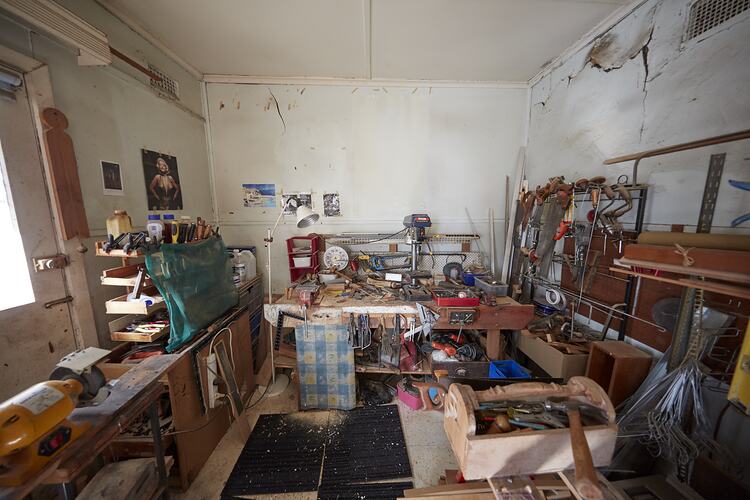 Digital photograph taken from the doorway of Joseph Scerri's home woodworking workshop in Brunswick, showing the whole space. The photograph was taken on 20 March 2023 by Museums Victoria photographer Jon Augier to document the workspace, including tools, materials and moulds, in which Joseph created the guitar and mandolin acquired for the Museum's collection.