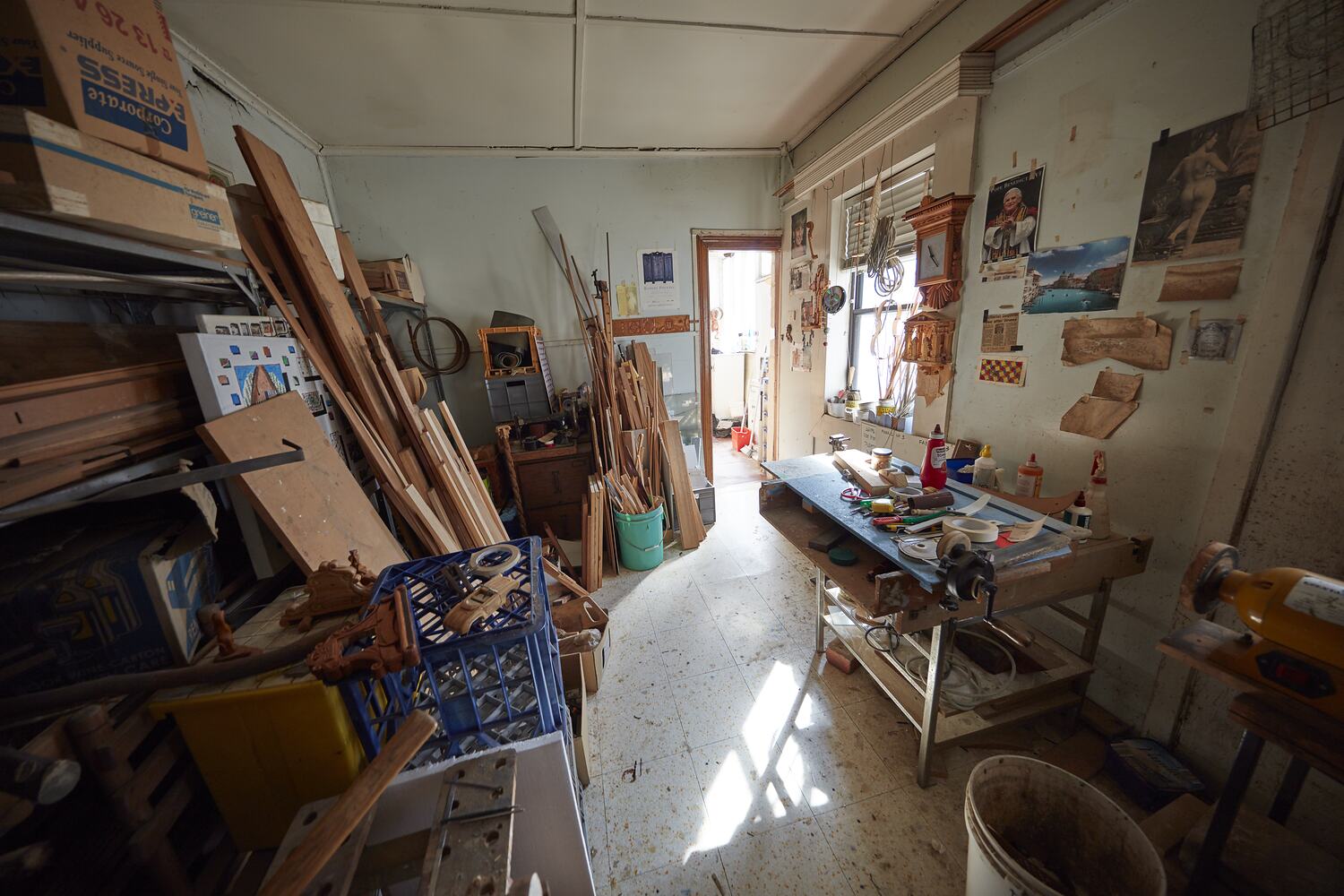 Digital photograph taken from the rear of Joseph Scerri's home woodworking workshop in Brunswick, looking towards the doorway. The photograph was taken on 20 March 2023 by Museums Victoria photographer Jon Augier to document the workspace, including tools, materials and moulds, in which Joseph created the guitar and mandolin acquired for the Museum's collection.